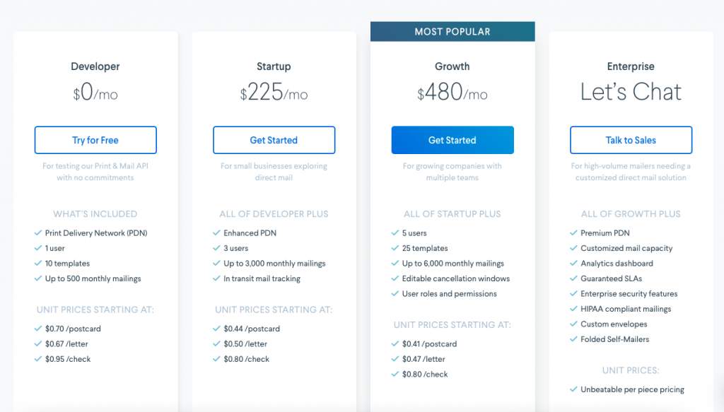 Postalytics offers different plans for automated direct mailing in addition to their per piece pricing, which can be found on their website.